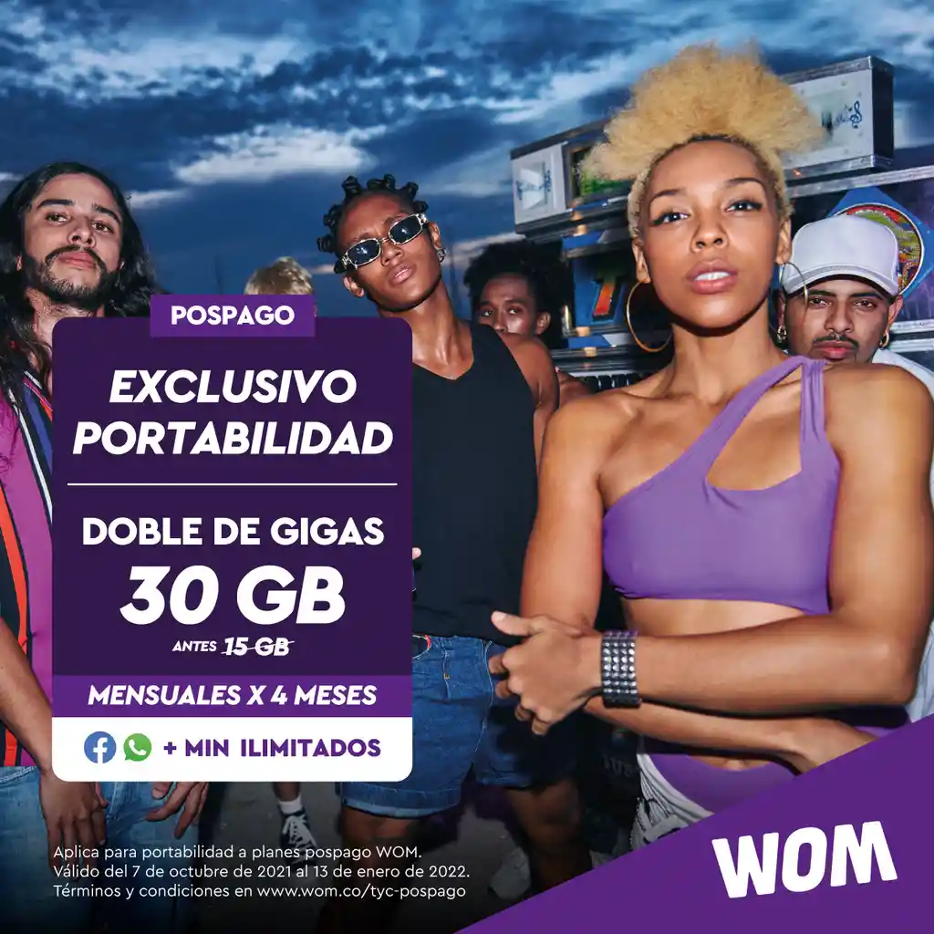Sim Card Pospago WOM portabilidad, Incluye 30 GB por 4 meses (15 GB a partir del mes 5), minutos y mensajes de texto ilimitados a todo destino nacional, WhatsApp, Facebook y messenger ilimitados Favor tener en cuenta que la contratación del servicio se hace vía telefónica. Si no superas las validaciones de riesgo, tu servicio será activado en modalidad prepago con un paquete de 30 días con las mismas capacidades ofrecidas inicialmente. Consulta TyC aquí. https://www.wom.co/tyc-pospago Para conocer el Contrato único de servicios pospago ingresa a hwww.wom.co/informacion-importante/contratos-de-servicios