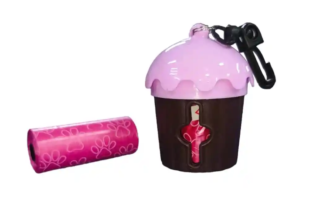 PORTABOLSAS EN FORMA DE CUPCAKE CON 2 REPUESTOS, porta bolsas para poder llevar de forma más fácil las bolsitas de las heces de los consentidos, ideal para colgarla en la correa