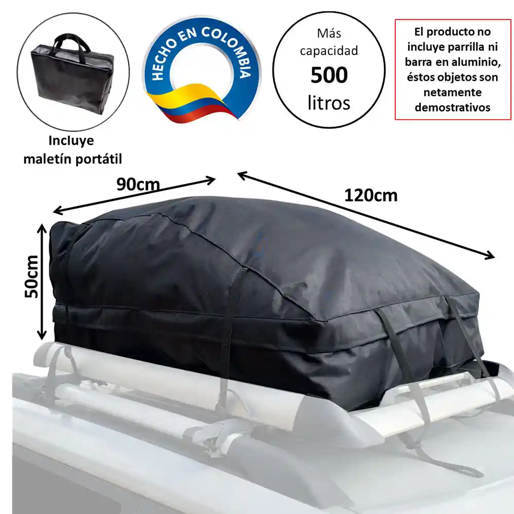 -MEDIDAS: largo 120cm, ancho 90cm, alto 50cm aproximadamente. -Gran capacidad de 500 litros para diferentes tipos de carga (no se recomienda para objetos cortopunzantes o filosos puesto que éstos pueden romper el producto). -Color: negro. -Material: lona-nylon impermeable, excelente calidad. -Diseño aerodinámico. -Fácil instalación. -Industria totalmente COLOMBIANA. -Importante: el producto no incluye parrilla ni barra en aluminio, éstos objetos son netamente demostrativos.