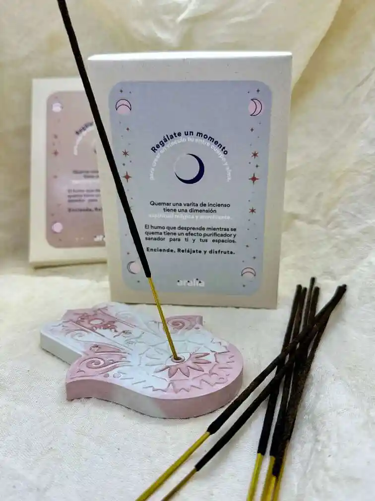 Quemar una varita de incienso tiene una dimensión espiritual mágica y envolvente. El humo que desprende mientras se quema tiene un efecto purificador y sanador para ti y tus espacios. Permite que la varita de incienso se mantenga fija y erguida mientras humea. MATERIAL: Cemento. Al ser un producto hecho a mano el color de la pieza puede tener una variación. CONTENIDO: 5 varas de incienso, porta incienso, empaques MEDIDAS: Largo 12 cm, Ancho: 19 cm, profundidad 1 cm.