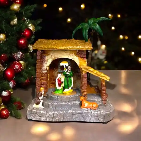 La imagen muestra un pesebre, también conocido como belén o nacimiento. Es una representación artística del nacimiento de Jesucristo, que forma parte de la tradición navideña.
