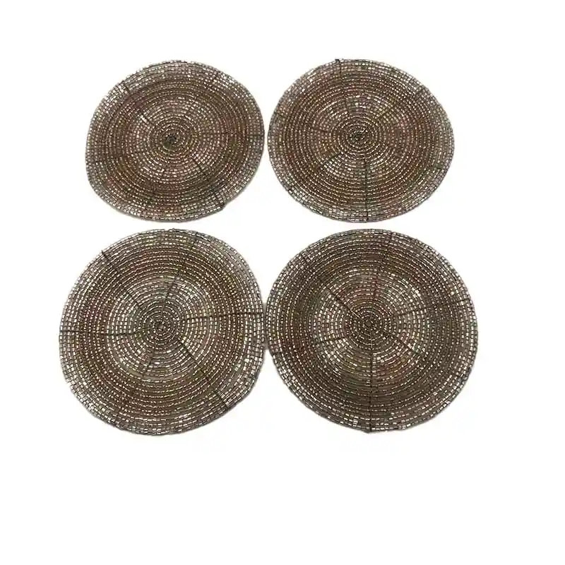 CAJA DE 4 PIEZAS DE PORTAVASOS REDONDOS. CADA UNO TIENE UNA MEDIDA DE 10CM SON RECUBIERTOS COMPLETAMENTE EN CANUTILLO DE COLOR PLATEADO. ES HECHO ARTESANALMENTE A MANO Y POR LO TANTO TIENE CUIDADO ESPECIAL.