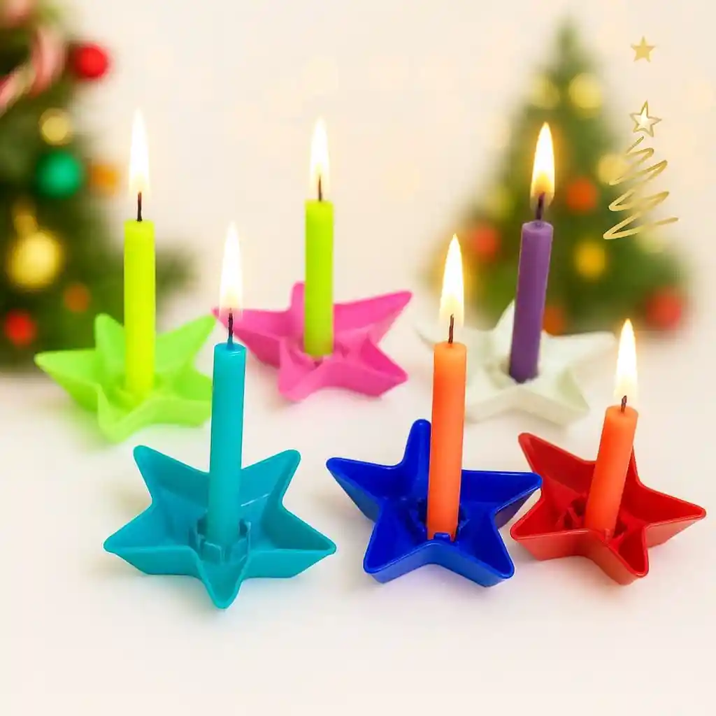 Ilumina tus celebraciones con este hermoso set de 6 portavelas con forma de estrella, elaborados en colores vibrantes y llamativos que aportan un toque festivo a cualquier espacio. Son ideales para navidad, cumpleaños, decoración de mesas, eventos, novenas o ambientes cálidos y especiales. ✔️ Diseño estable y seguro ✔️ Material resistente y reutilizable ✔️ Colores surtidos y brillantes ✔️ Perfectos para velas delgadas tipo navideñas Importante: El producto NO incluye las velas, solo los portavelas.