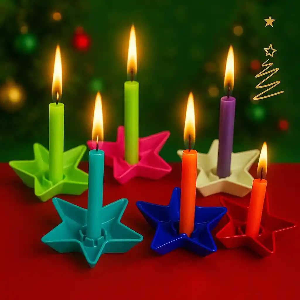 Ilumina tus celebraciones con este hermoso set de 6 portavelas con forma de estrella, elaborados en colores vibrantes y llamativos que aportan un toque festivo a cualquier espacio. Son ideales para navidad, cumpleaños, decoración de mesas, eventos, novenas o ambientes cálidos y especiales. ✔️ Diseño estable y seguro ✔️ Material resistente y reutilizable ✔️ Colores surtidos y brillantes ✔️ Perfectos para velas delgadas tipo navideñas Importante: El producto NO incluye las velas, solo los portavelas.