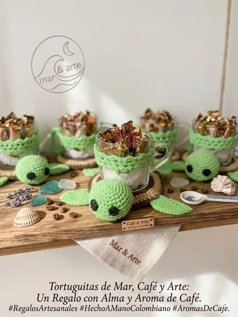 Posa taza de tortuga tejido a crochet con taza y caramelos de cafe. Para poder disfrutar de tu tinto o regalar algo artesanal hecho a mano