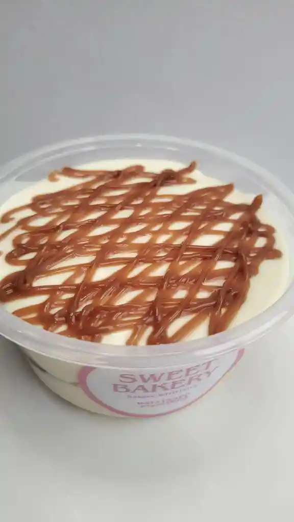 Bizcocho de vainilla bañado en salsa de tres leches, entretelado con una crema de yogurt y salsa de arequipe. Tamaño 12 OZ