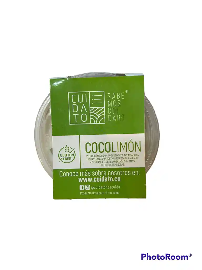 Postre húmedo con yogurt de coco con sabor a limón vegano, con torta esponjosa de harina de almendras y leche condesada con estevia y leche de almendras.