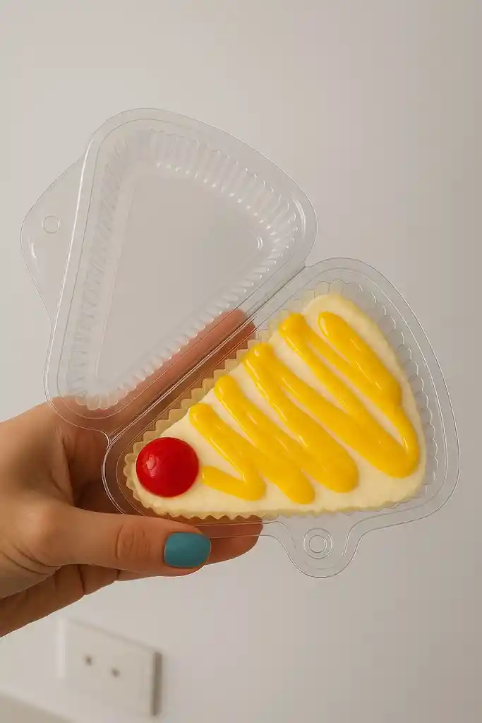 Deliciosa porción de postre frío en forma triangular, presentada en un envase transparente individual. Está cubierto con una suave capa de crema y decorado con líneas generosas de salsa de durazno brillante que le dan un toque jugoso y apetitoso. En la punta del triángulo, una cereza roja destaca como el detalle perfecto para completar esta dulce tentación. Ideal para disfrutar como merienda o postre después de una comida.