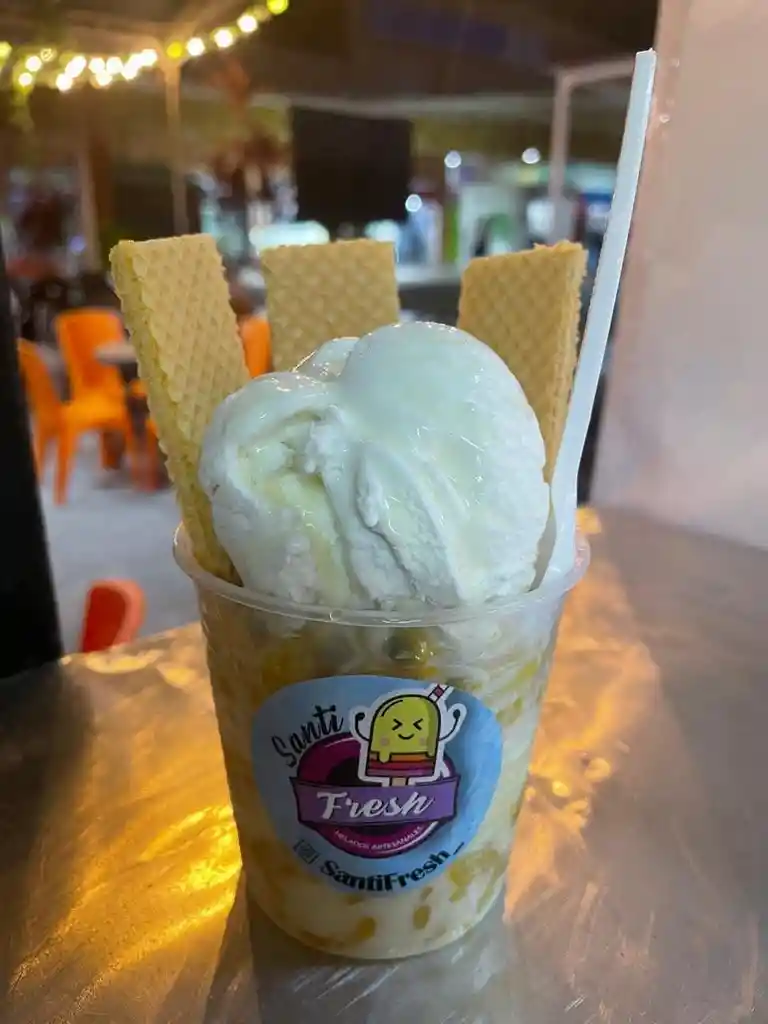Delicioso postre de maracumango, con base de mango en trozos, maracuyá, helado de vainilla, con lechera de la casa y galleta