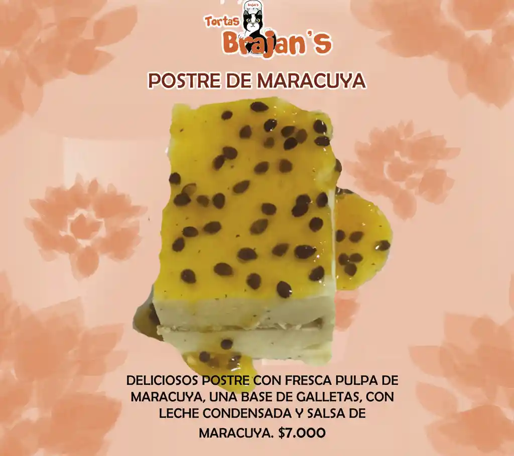 Delicioso postre, con fresca pulpa de maracuya, una base de galletas, con leche condensada y salsa de maracuya.
