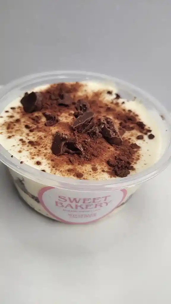 Bizcocho de chocolate bañado en salsa de tres leches, entretelado con una crema de yogurt y salsa de milo con tropezones de nuggets de milo. Tamaño 12 OZ
