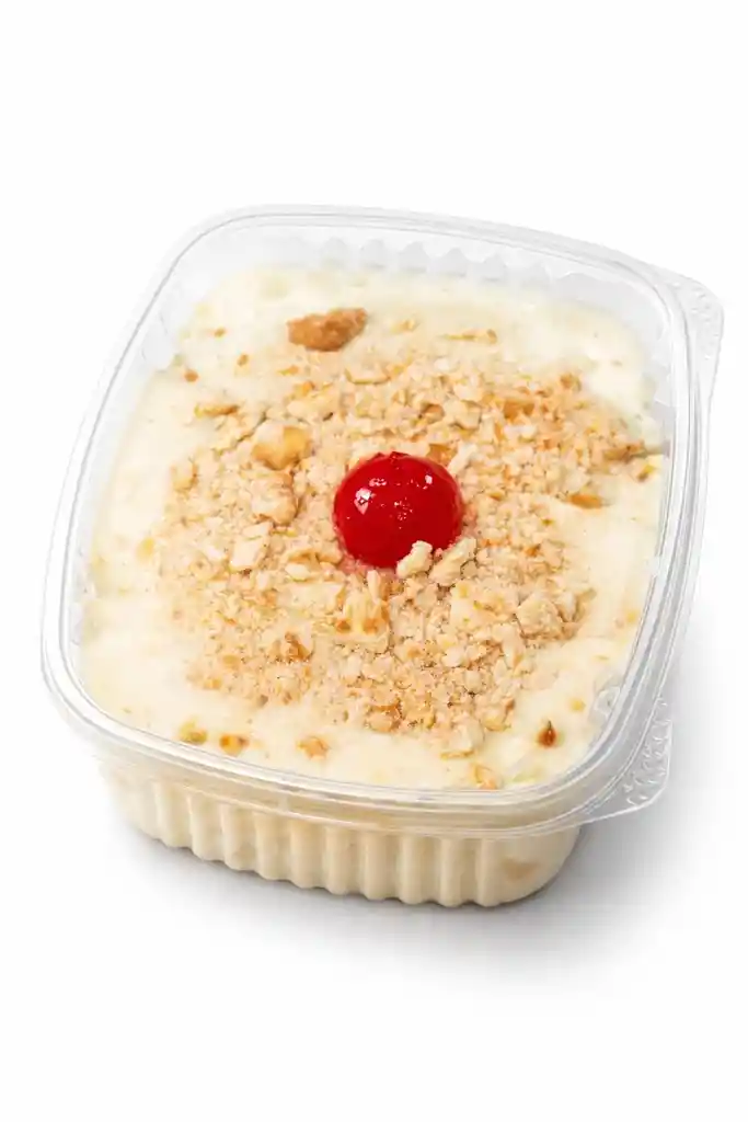 Postre a base de crema tres leches, doble capa de galleta, coronado con galleta y cereza.