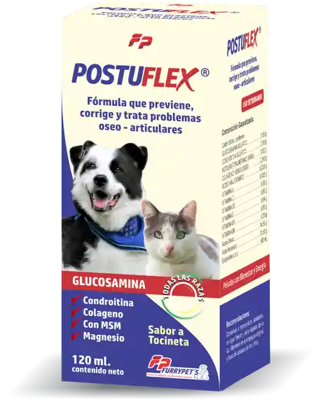 Emulsión con glucosamina, condroitina, colágeno hidrolizado, msm, ácido hialurónico, entre otros, sabor a tocineta, coadyuvante en problemas osteoarticulares en perros y gatos.