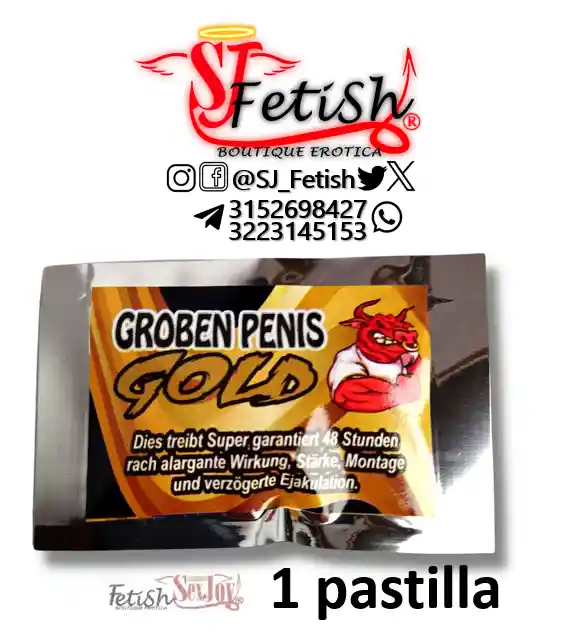 Groben Penis Gold Potenciador Masculino. Cápsula potenciadora de rápida actuación, en solo 40 minutos y su efecto puede durar hasta 72 horas con estimulación. Beneficios: Potencia la erección, retarda la eyaculación, energiza, le da engrosamiento al pene, aumenta el fluido del semen y le da mucho aguante. Cuáles son las ventajas de tomar GROBEN PENIS GOLD? Produce una erección consistente. Aumenta la sensibilidad y apetito sexual. Incrementa la duración de la erección. Aumento de la confianza sexual. Natural 100% No es adictivo. Administración y dosificación: Tome una pastilla 1 hora antes de la actividad sexual. ¿Cómo mejorar el efecto de las pastillas? Tomar la pastilla con un tiempo previo mayor al sugerido. Tomar la pastilla con el estómago casi vacío y comer algo muy suave después. no ingerir lácteos ni bebidas azucaradas. Si tiene el estómago lleno, habrá más sangre circulando en el sistema digestivo, en lugar de donde realmente la necesitas en el momento del acto sexual. Tomar mucha agua. El juego previo sexual (besos, abrazos, caricias) es muy importante. Entre más largo sea este, prepara el cuerpo e incrementa la circulación de la sangre. ¡No te preocupes! Deja el estrés atrás y disfruta el momento. ¡Relaja los músculos! Los músculos tensionados reducen el flujo sanguíneo y puede llevar a una eyaculación prematura. Disponible en sj fetish boutique erotica, boutique erotica, boutique erotica armenia, sex shop, sex shop armenia, tienda erotica, tienda erotica armenia, sexshop, sexshop armenia, tienda para adultos, tienda para adultos en armenia, tienda para adultos armenia