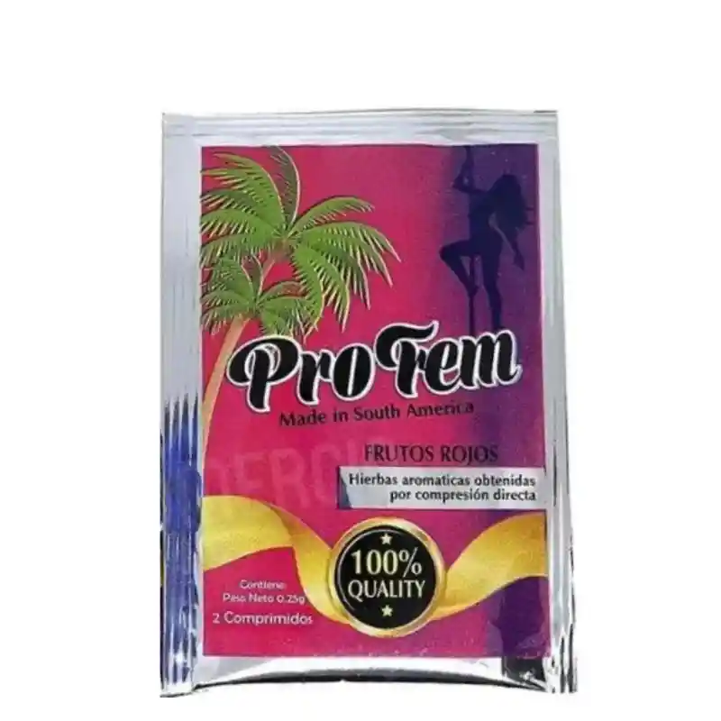 POTENCIADOR SEXUAL FEMENINO PROFEM 2 COMPRIMIDOS producto 100% natural aumenta la energía de la mujer y el deseo sexual. elimina el cansancio físico para un mayor disfrute en la relación sexual. Este producto sirve para sensibilizar el cuerpo, por lo que cada estimulo será mucho más placentero. Permite a la mujer disfrutar placenteramente cada momento de su relación intima, convirtiéndose en una mujer más desinhibida y más ardiente a la hora del sexo. Este estimulante evita la frigidez en la mujer y abre el apetito sexual en ellas en minutos, hace que se contraiga la vagina y se aumente la producción de endocrina y estimula los nervios, actúa rápidamente y estimula las partes sensibles del cuerpo. CARACTERISTICAS ESPECIFICAS Modo de uso: el contenido de cada sobre equivale a 2 PASTILLAS,tomala con cualquier tipo de liquido que no contenga leche una hora antes de la relacion y estimula a tu pareja para mejores resultados .... no tiene color no tiene sabor presentacion SOBRE X2 pastillas registro sanitario invima: NSA 0027762017 ELABORADO POR : Laboratorio VITAMAC S.A.S.