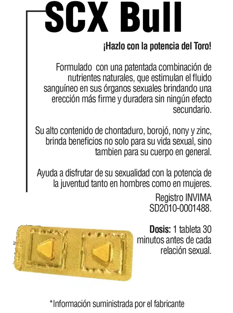 POTENCIADOR SCX BULL X4 PARA HOMBRE Y MUJER Cantidad: 4 pastillas Descripción ¡Hazlo con la potencia del Toro! Formulado con nutrientes naturales. Registro INVIMA SD2010-0001488. Pastilla para el consumo femenino y másculino. Formulado con una patentada combinación de nutrientes naturales, que estimulan el fluido sangíneo en sus òrganos sexuales brindando una erección más firme y duradera sin ningún efecto secundario. Ayuda a disfrutar de su sexualidad con la potencia de la juventud tanto en hombres como en mujeres. Su alto contenido de Chontaduro, Borojó, Nony y Zinc, brinda beneficios no solo para su vida sexual, sino tambien para su cuerpo en general. Dosis: 1 tableta 30 minutos antes de cada relación sexual. Efectos femeninos: Contiene principios activos naturales que brindan beneficios medicinales para aumentar la libido de la mujer. Sex Bull y su patentada formulación hace posible la dilatación de los vasos sanguíneos del área genital, que a su vez incrementa la excitación, el deseo y el placer sexual femenino. Aumenta el flujo sanguíneo en sus órganos sexuales ha demostrado que aumenta la libido, produce mayor lubricación, mejora la sensibilidad al tacto y habilidad para lograr un orgasmo. Mecanismo de acción: Scx Bull actúa sobre las enzimas que promueve la degradación del GMPc, que regula el flujo de sangre en los órganos sexuales. Parte del proceso fisiológico de la excitación incluye al sistema nervioso parasimpático causando la liberación de óxido nítrico. Lo que deriva en una relajación del músculo liso de los órganos sexuales mediante vasodilatación de las arterias. La vasodilatación incrementa el flujo de sangre en el interior de la vagina, causando así mayor lubricación y disposición al acto sexual Aviso: No somos los fabricantes de estas pastillas. Cada marca de pastilla potenciadora tiene efectos diferentes en cada individuo y esto depende de sus hábitos de trabajo, tipo de cuerpo y tamaño, edad, actividades diarias, estilo de vida ¡y hasta lo que come! Existen cientos de referencias de pastillas en el mercado y realizamos un trabajo de selección muy estricto en el cual nos aseguramos de ofrecer en nuestra tienda únicamente las de más alta calidad y efectividad. Sin embargo, si es la primera vez que tomas esta pastilla, recomendamos comenzar con una, para que conozcas sus efectos. Confidencialidad: Tus pedidos se envían en una caja o sobre totalmente sellado opaco sin nigún tipo de marcas externas. Para nosotros es muy importante tu privacidad.