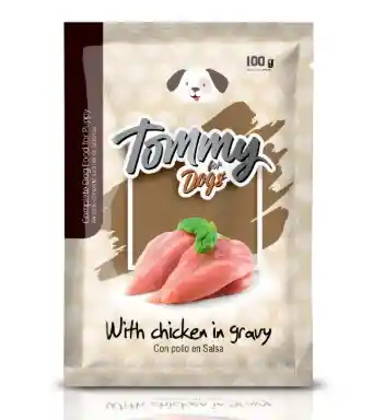 Tommy perro cachorro trozos de pollo en salsa, es un alimento húmedo completo para perros cachorros desde el destete hasta los doce meses de vida para todas las razas, completos y equilibrados