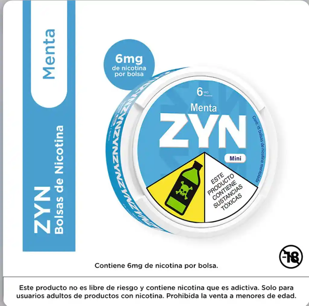 Bolsas de Nicotina ZYN Menta 6mg – Lata x15 bolsas Disfruta el sabor refrescante a menta con 6mg de nicotina por bolsa. Cada lata contiene 15 bolsas listas para usar, sin humo ni combustión. ⚠️ Contiene nicotina. 🔞 Mayores de edad.