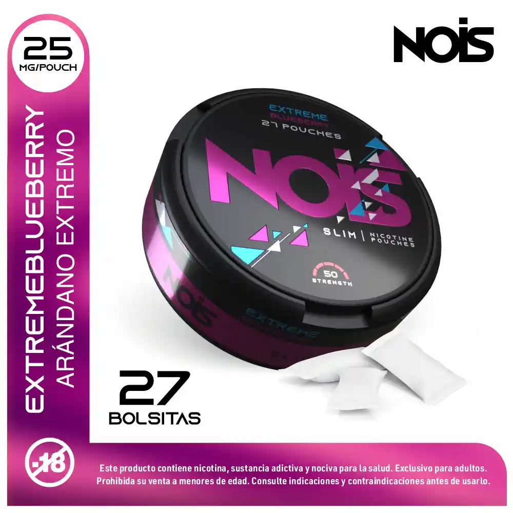 Pouche de Nicotina marca Nois sabor a Extreme Blueberry. Fuerza de nicotina: 25 mg. Bolsa de nicotina de administración oral equivalente a aproximadamente 1 paquete de cigarrillos. Prohibida la venta a menores de edad. Producto nocivo para la salud que contiene nicotina, sustancia altamente adictiva. Antes de consumir consulte las indicaciones y contraindicaciones de uso.