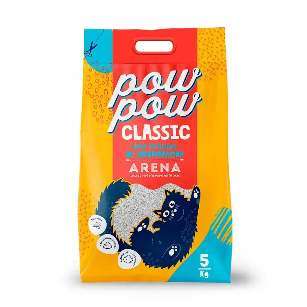 La arena Powpow Classic tiene los siguientes beneficios: Poca emisión de polvo. Arena con gran capacidad de aglomeración Indicada para todas las etapas de vida. Grano tecnificado, para evitar que se quede pegado en las paticas de tu mascota. Neutraliza malos olores sin aromas artificiales para una mejor aceptacion por parte de tu gato. Hecha a base de betonita, la que permite una aglomeracion instántanea de la orina y las heces, lo que permite una fácil limpieza de la arenera y optimización de la arena.