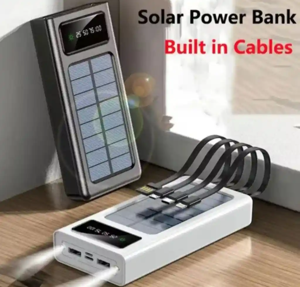 Capacidad: 12,000mAh, permitiendo múltiples cargas para dispositivos. Funcionalidad Solar: Cuenta con paneles fotovoltaicos que permiten recargar la batería interna utilizando luz solar, aunque este método es más lento que la carga por cable. Cables Integrados: Incorpora cables de carga (como USB-C o Lightning) para mayor comodidad al cargar dispositivos sin necesidad de llevar cables extra. Puertos y Extras: Incluye puertos USB tradicionales y pantallas LED para indicar el nivel de batería restante.