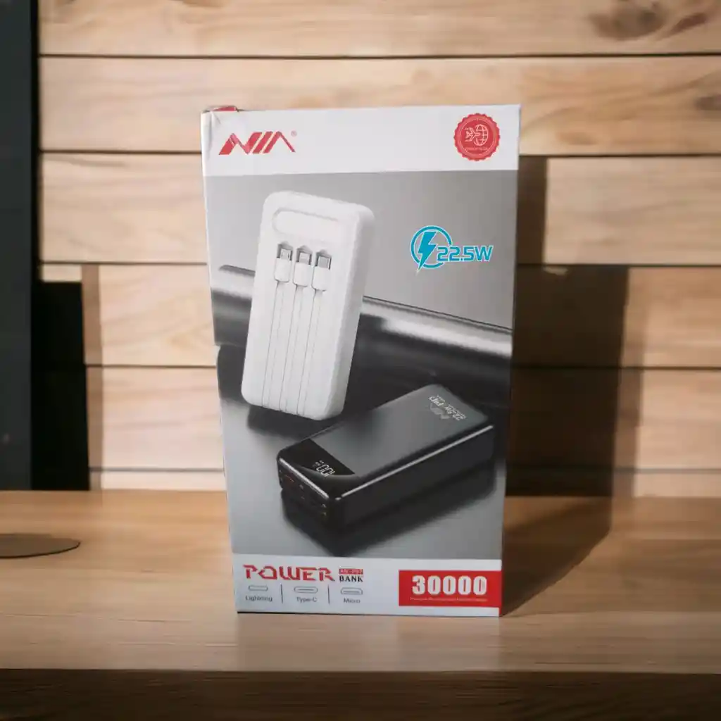 "Potencia ilimitada en la palma de tu mano: La Power Bank Nia de 30.000 mAh con carga rápida de 22.5W. Nunca te quedes sin energía, mantén tus dispositivos encendidos todo el día."