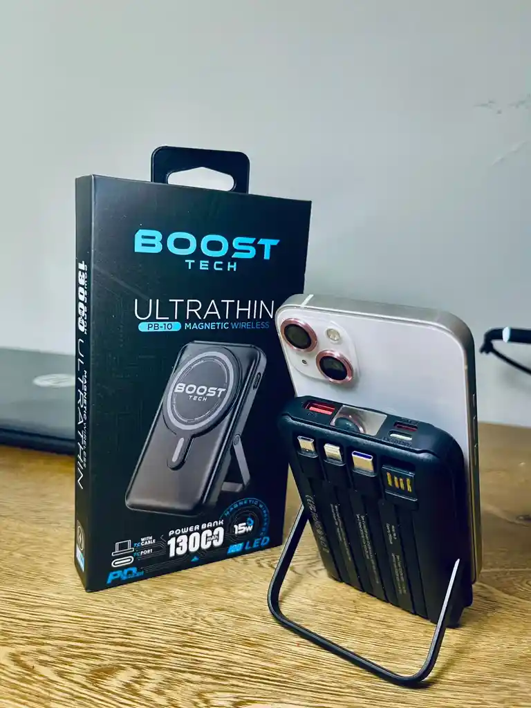 Batera externa portátil magnético e inalámbrico. Capacidad: 13,000 mAh. Carga: Admite carga inalámbrica de 15W y también incluye cables integrados para carga por cable. Función extra: Cuenta con un soporte integrado que permite sostener el teléfono mientras se carga, ideal para ver videos o videollamadas