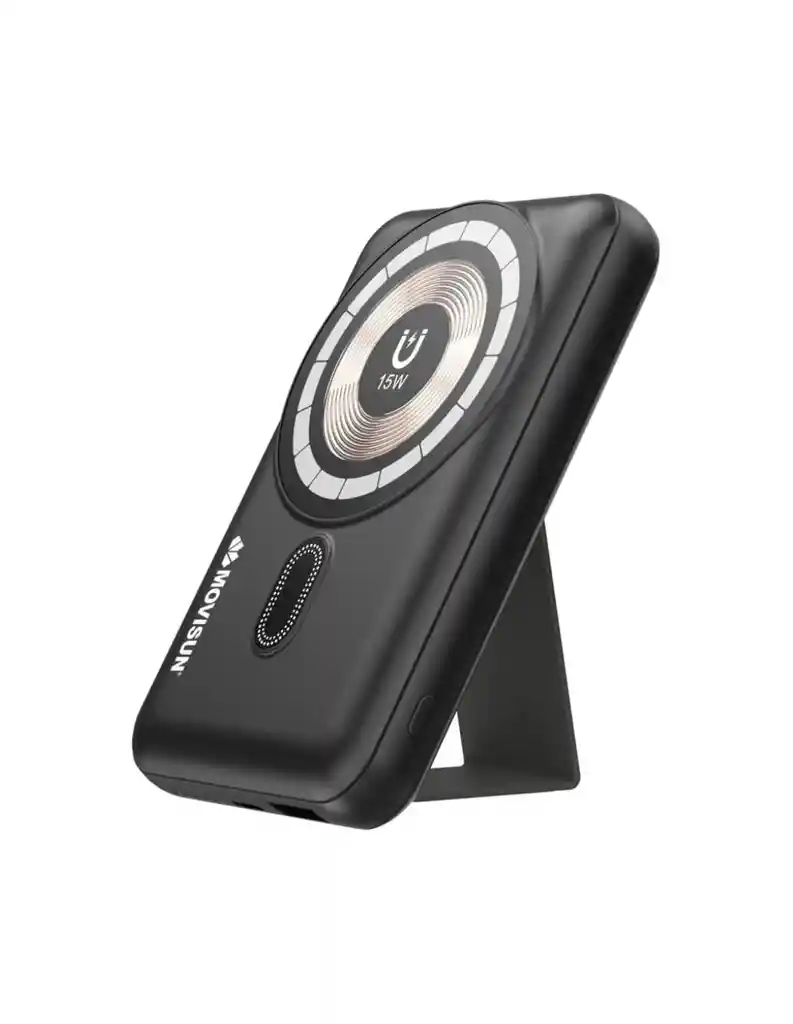 "¡Energía de alto rendimiento en la palma de tu mano! El cargador portátil Movisun I-1000 es el aliado perfecto para quienes no pueden quedarse sin batería. Con una capacidad real de 10,000 mAh, este dispositivo combina potencia, diseño ultra compacto y la última tecnología de carga inalámbrica magnética. Características Principales: Carga Magnética Inalámbrica (15W): Olvídate de los cables. Compatible con tecnología magnética (MagSafe) para una sujeción firme y carga eficiente sin interrupciones. Carga Súper Rápida por Cable: Equipado con un puerto USB-A de 22.5W y un puerto USB-C (PD) de 20W, ideal para cargar tu smartphone de 0 a 50% en tiempo récord. Capacidad Real: 10,000 mAh que te brindan entre 1.5 y 2.5 cargas completas dependiendo de tu modelo de celular. Soporte Integrado: Incluye un ""kickstand"" o base retráctil para que puedas ver videos o realizar videollamadas mientras tu teléfono se carga cómodamente. Diseño Premium y Seguro: Fabricado con materiales resistentes al fuego y protección contra sobrecargas, cortocircuitos y sobrecalentamiento."