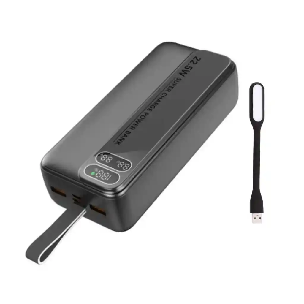 Capacidad de Batería: 30.000 mAh completamente reales. ¿ Carga Rápida. ¿ En color Blanco y Negro. ¿ Pantalla Led, muestra porcentaje de Carga. ¿ Entrada de carga Tipo V8. ¿ Dos salidas USB. ¿ Una salida o entrada Tipo C. ¿ Con Linterna. ¿ Viene con cable USB Tipo C. ¿ Carga tres dispositivos al tiempo. ¿ INCLUYE Cable Tipo C. ¿ OBSEQUIO Cable Tipo Micro USB (V8)