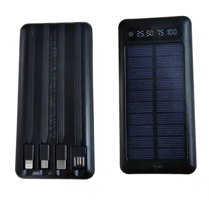 Power Bank Solar TM • Capacidad: 30.000 mAh • 1 Puertos USB de Salida • Amperaje de Salida: 2.1A MAX • Entrada TypeC: 2A MAX • Entrada Micro: 2A MAX • Cables propios para carga Micro, TypeC y iOS • Panel Solar: 200mAh • Voltaje: 5V • Pantalla LCD Indicadora de Carga • Función de Linterna