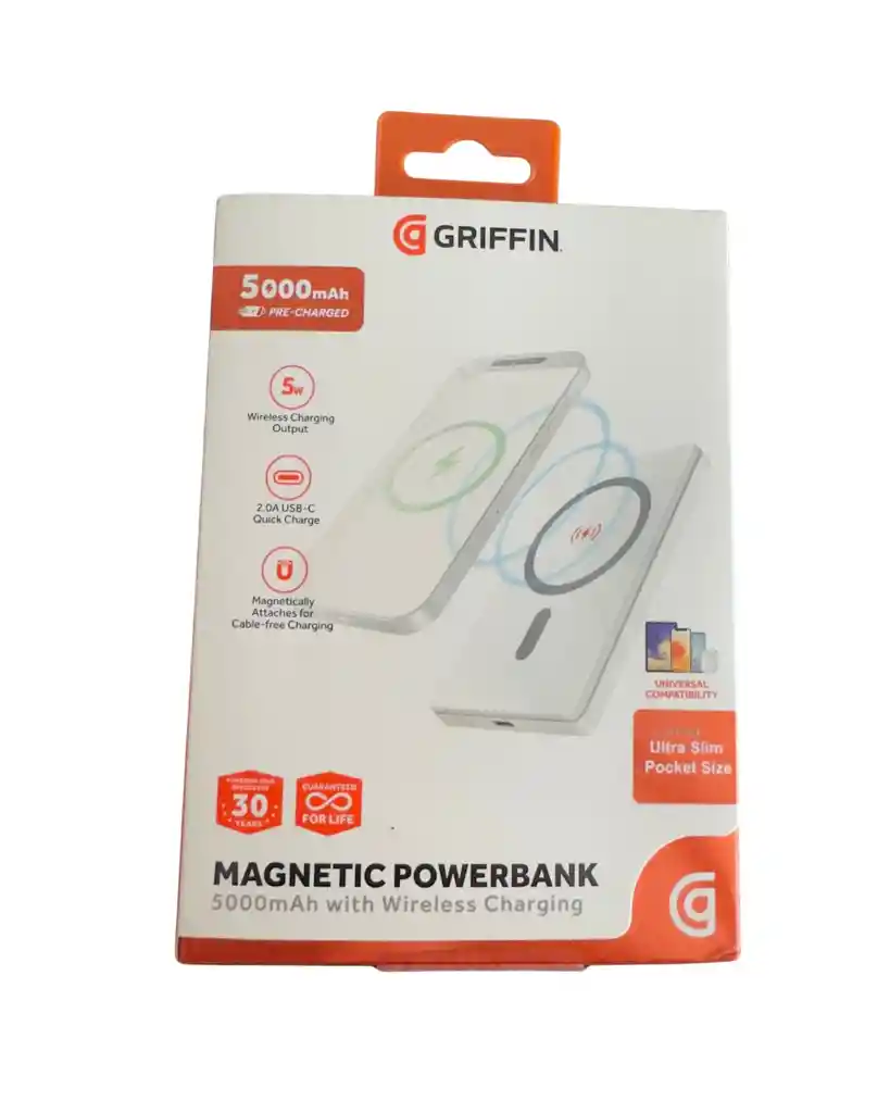 La Powerbank Magnética Griffin 5W se ajusta automáticamente a la parte trasera de tu celular gracias a su sistema magnético tipo MagSafe, ideal para usar mientras te mueves. Características destacadas: 🧲 Magnética tipo MagSafe: Se adhiere firmemente sin necesidad de cables. ⚡ Carga inalámbrica de 5W: Energía estable para mantener tu batería siempre lista. 🔋 Compacta y ligera: Perfecta para bolsillos, carteras y uso diario. 📱 Compatible con iPhone con MagSafe 🔒 Segura y confiable: Protección contra sobrecarga, sobretemperatura y fallas de voltaje. 🔌 Puerto adicional para carga por cable: Úsala también como powerbank tradicional.