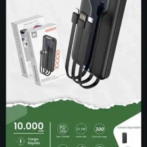 Mantén tu energía siempre al máximo con el Power Bank Movisun ROCKET P17. Diseñado para usuarios que necesitan potencia y practicidad, este cargador portátil de 10 000 mAh combina carga rápida de 22.5 W con cables integrados (USB-C, Lightning y USB-A) para que puedas recargar cualquier dispositivo sin llevar accesorios extra. Su pantalla LED inteligente te muestra el porcentaje de batería, voltaje y potencia en tiempo real, mientras que sus múltiples puertos (USB-A y Tipo C) te permiten cargar varios equipos a la vez. Gracias a su diseño compacto y resistente, es perfecto para llevar en el bolsillo, bolso o morral, ideal para viajes, oficina, universidad o actividades al aire libre. Cuenta con protecciones contra sobrecarga, sobrecalentamiento y cortocircuitos, garantizando seguridad tanto para el power bank como para tus dispositivos. Con 4 meses de garantía, el Movisun ROCKET P17 es la opción inteligente para mantenerte siempre conectado en cualquier parte. Características destacadas: Capacidad: 10 000 mAh Potencia: 22.5 W (carga rápida PD y QC) Pantalla LED inteligente 3 cables integrados: USB-C, Lightning y USB-A Puertos adicionales: USB-A y Tipo C (entrada/salida) Diseño compacto y portátil Protección contra sobrecarga y sobrecalentamiento