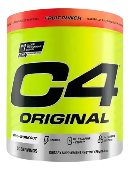Pre Entreno C4 – Doble Potencia, Doble Rendimiento ⚡ Lleva tus entrenamientos a un nivel superior con C4 de 60 servicios. Este pre-entreno te proporciona el doble de energía explosiva, enfoque mental, y resistencia, para que puedas entrenar más duro y por más tiempo. 💥 Beneficios: Energía intensa, mayor concentración, y resistencia duradera. 🚀 Uso: Mezcla 1 scoop con agua y consume 20-30 minutos antes de entrenar.