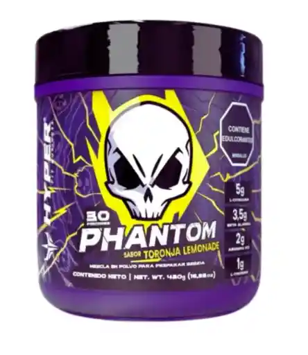 Descripción PHANTOM Pre entreno de Hyper supps es un suplemento energizante, vasodilatador, que mejora el desempeño deportivo y reduce la fatiga durante la actividad física. Combina 5g de L-Citrulina, 3,5g de Beta Alanina, 2g de Arginina HCL, 1g de L-Tirosina, 300mg de Cafeína y 60mg de Niacina, Un producto con una formulación óptima, enfocada en lo simple y efectivo, un balance perfecto entre lo que esperas de un pre-entreno avanzado y un sabor a toronja intensamente refrescante. PHANTOM fue diseñado para lograr darte sesiones de entrenamiento más intensas y de alto nivel, mejorando los niveles de energía, los bombeos musculares y optimizando el desempeño intra entreno, reduciendo además la fatiga. Su formulación lo hace una excelente opción al momento de elegir tu suplemento pre entrenamiento. Phantom pre entreno Tabla nutricional. Por 1 Scoop= 16g (el dosificador viene incluido en el empaque) aporta: 50 Calorías 0g Grasa (0g Grasa saturada – 0g Grasa trans) 40mg Sodio 1g Carbohidratos totales ( 0g Fibra dietaría – 0g Azúcar) 11,5g Proteína. 5g L-Citrulina 3,5g Beta alanina 2g L-Arginina HCL 1g L-Tirosina 300mg Cafeína 60mg Niacina Cada unidad de producto (1 recipiente de 480g de PHANTOM) contiene 30 servicios. Ingredientes: Extracto limón [(L-Citrulina, Beta alanina, acidulante (ácido cítrico), L-arginina HCI, L-tirosina, sabor natural y artificial)], cafeína anhidra, sucralosa (edulcorante artificial), niacina (ácido nicotínico), cloruro de sodio, bicarbonato de sodio, dióxido de silicio (anticompactante), colorantes naturales curcumina E100 у carmin E120 Sin azúcar Presentación: 480g Sabor: Toronja lemonade ¿Para que sirve Phantom Pre entreno de hyper? En palabras sencillas: Para mejorar las sesiones de entrenamiento, adicionar intensidad y energía, bombeos musculares más notorios y para disminuir la fatiga. ¿Cómo tomar Phantom hyper? Mezclar una (1) Cuchara dosificadora (16g) de PHANTOM en agua, Revolver o agitar hasta disolver completamente e ingerir antes de la actividad física.
