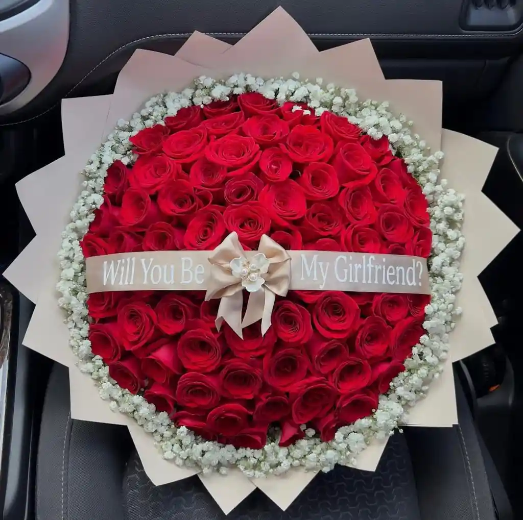 Un arreglo romántico compuesto por elegantes rosas rojas, símbolo del amor más profundo, rodeadas de delicadas flores blancas que resaltan la pureza de la intención. Al centro, una cinta con la pregunta que hace latir más fuerte: "Will You Be My Girlfriend?" Perfecto para una declaración inolvidable y llena de emoción.