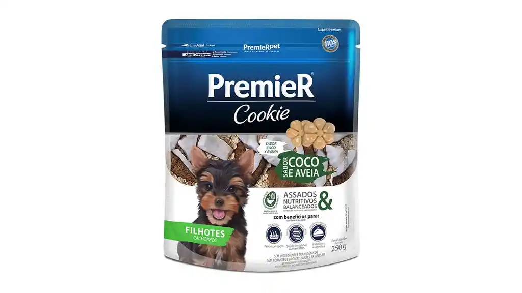 ara retribuir de forma divertida el amor incondicional y la amistad que los perros nos ofrecen, PremieRpet creó Premier Cookie, una galleta que reúne calidad, salud y sabor, diferente de todos los productos actualmente disponibles en el mercado. Premier Cookie Cachorros Coco y Avena 250gr es horneado, saludable, nutritivo y ofrece ingredientes cuidadosamente seleccionados y satisfacción comprobada.