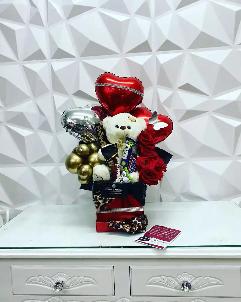 Ancheta en caja con peluche,globos,flores,variedad de golosinas y decorativos elegantes según imagen (tarjeta incluida)