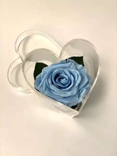 Caja en acrílico en forma de corazón con 1 rosa premium natural preservada que dura intacta por meses. Medidas: de 12x12cm apróx. Incluye Bolsa de lujo y tarjeta