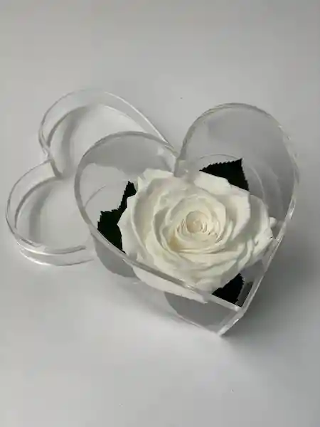 Caja en acrílico en forma de corazón con 1 rosa premium natural preservada que dura intacta por meses. Medidas: de 12x12cm apróx. Incluye Bolsa de lujo y tarjeta