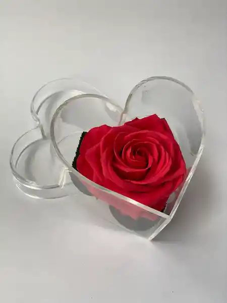 Caja en acrílico en forma de corazón con 1 rosa premium natural preservada que dura intacta por meses. Medidas: de 12x12cm apróx. Incluye Bolsa de lujo y tarjeta
