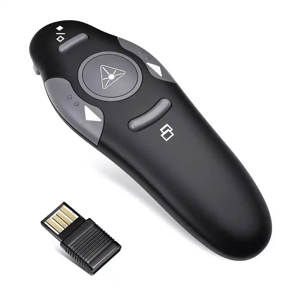 ¿ Clicker de presentación inalámbrico portátil No hay que instalar ningún software. Simplemente conecte el receptor a un puerto USB para comenzar. Los botones que tienen acceso rápido a diferentes funciones son fáciles de encontrar al tacto. Y cuando termine el programa, puede guardar el receptor en el soporte de la batería. Dentro del presentador inalámbrico. Características del clicker: Boton interruptor Material: ABS Estilo de luz: haz de luz Color claro: rojo Clase 3R Energía de la batería: 1 batería de 1.5v AAA (no incluida) Tamaño: 130 x 90 x 40 mm / 5.1 x 3.5 x 1.6 in (Aprox.) Distancia de control: 10m-15m (la distancia efectiva cambiará con el entorno circundante) Características del receptor: Material: ABS Sistema operativo compatible: win 2000, XP, Vista, Win7 , Win8 , Win10 , MAC OS, Linux Interfaz: USB1.1, USB2.0, USB3.0 Tamaño: 65 mm x 20 mm x 11 mm / 2,56 x 0,79 x 0,43 pulg. (Aprox.) Listado del paquete: 1 x Clicker de presentación 1 x receptor USB ultra delgado 1 x manual de usuario