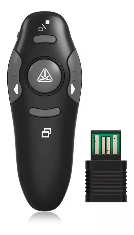 Características: Este presentador inalámbrico de 2,4 GHz de color negro de presentación es pequeño, portátil y con más aplicaciones. Un agradable asistente esencial para demostraciones o exposiciones, puede fácilmente señalar el PPT o la pizarra en cualquier rincón del salón de clases. Hacer que tus demostraciones o presentación parezcan más dinámicas. Este presentador es también el mejor regalo para amigos y familias Sin configuración de complicaciones, simplemente conéctalo al puerto USB de tu ordenador El receptor USB es plug and play-no requiere controlador Ahorro de Energía, ligero, adecuado para poner en tu bolsillo o bolsos Este presentador de alta calidad adopta la última tecnología óptica y microelectrónica Propiedades del producto: Control remoto: Sí