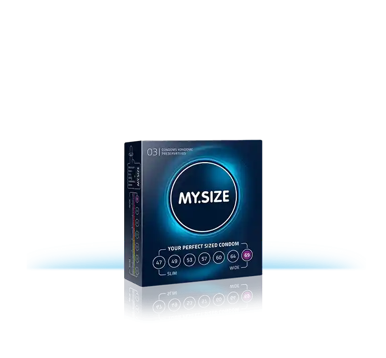 Encontrarás MY.SIZE condones en tu tamaño 69 en cajas de 3 condones Ancho: 69mm Longidud: 223mm Material: látex de caucho natural Forma: cilíndrica Lubricante: silicona Depósito: si Espesor de pared: 0.06mm Calidad: ISO 4074