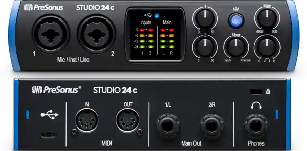 Interfaz de Audio Usb Presonus Studio 24C Interface Studio24C Calidad Profesional en su Estudio de Grabación Doméstico y en Ruta. Genial Para Estudio de Grabación, Músicos en Ruta, Guitarristas, Podcasters y Transmisión de Directos, el Interfaz de Audio Alimentado Por Bus Studio 24C de 2 Entradas y 2 Salidas Ofrece 2 Entradas Combo Micro/Línea/Instrumento en el Panel Frontal Con Previos de Micro de Estado Solido Xmax/L de Presonus, 2 Salidas de Línea en el Panel Posterior, E/S Midi y Control de Monitorización Directa Incorporado.