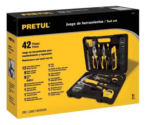 Contiene 42 Unidades.9 Dados 5 a 13 mm 3 Puntas Phillips Ph1 a Ph3 3 Puntas Planas 4 a 6 mm 3 Puntas Torx T10 a T20 1 Adaptador Para Dados 12 Llaves Allen 0.9 a 6 mm 1 Pinza de Chofer 6" 1 Pinza de Punta y Corte 6" 1 Llave Ajustable 1 Desarmador Joyero Plano 1 Desarmador Joyero Phillips de Ph0 1 Martillo Uña Curva 8 Oz 1 Desarmador Para Puntas 1 Flexómetro 3 m 1 Nivel 8" 1 Navaja 6" 1 Tijera 8" 1 Organizador Para Puntas 1 Organizador Para Llaves Allen