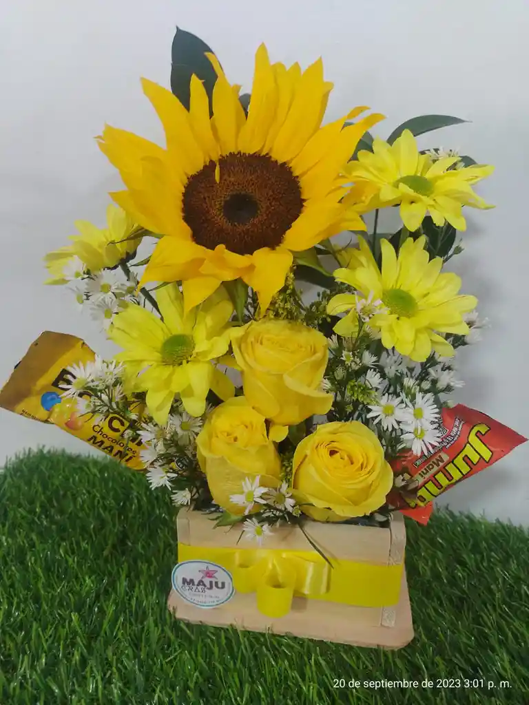 Arreglo floral amarillo con diferentes flores color amarillo.
