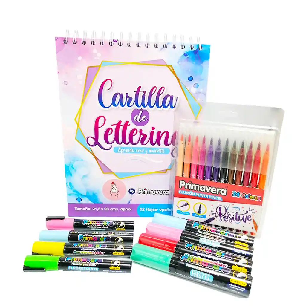 Kit Lettering Libro Guía + Plumones + Marcadores Contenido de kit 1 Paquete de marcadores punta pincel x 24 colores. -Trazo variable 4.0 mm -Colores vivos -Ventila en la tapa, durables, lavables. Plumón flexible con punta ideal para trazos finos. - 4 marcadores para póster, punta gruesa 15mm, colores vivos y pastel - 4 marcadores para poster punta fina de 6mm y 2mm, colores vivos y pastel Para uso en vidrio, espejo, papel, cerámica, plástico, piedra, etc. Marcador fabricado con tinta a base de agua tipo tempera. A prueba de agua una vez seca la tinta Se puede remover de superficies como vidrios y ventanas. Tinta de alta pigmentación y opacidad con una alta resistencia al agua y a la decoloración. 1 Cuaderno Argollado de Guía completa, letras y plantillas con motivos para desempeñarte a la hora de escribir o diseñar tarjetas, Cartas, Globos, o diversos espacios. Contenido : abecedario, números, hojas de práctica, líneas de trazos. Cantidad de hojas: 52 en opalina de 180 gr Tamaño 21,5 x 28 cms. aprox. pasta dura.