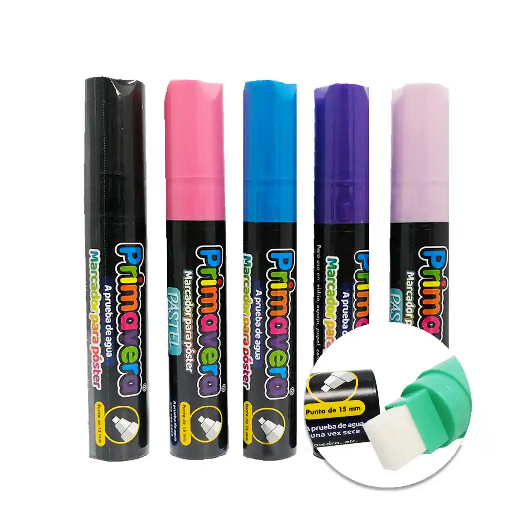 Marcadores Para Póster X 5 Punta 15 mm Primavera. Para uso en: vidrio, espejo, papel, cerámica, plástico, piedra, etc. - Marcador fabricado con tinta a base de agua tipo tempera. - A prueba de agua una vez seca la tinta. - Se puede remover de superficies como: vidrio y ventanas. - Tinta de alta pigmentación y opacidad con una alta resistencia al agua y a la decoloración. **una vez realizada la compra, acuerdas los colores con el vendedor. sujeto a disponibilidad**