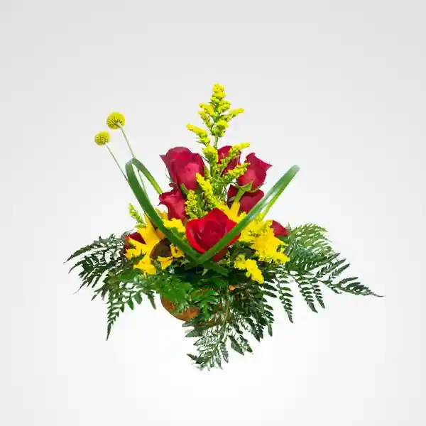 Arreglo floral en maceta de cerámica elaborado con 12 rosas rojas, 4 girasoles, crapedias y fresco follaje compuesto de cintillas, solidago y helecho cuero. de color Multicolor ideal para el Felicitaciones