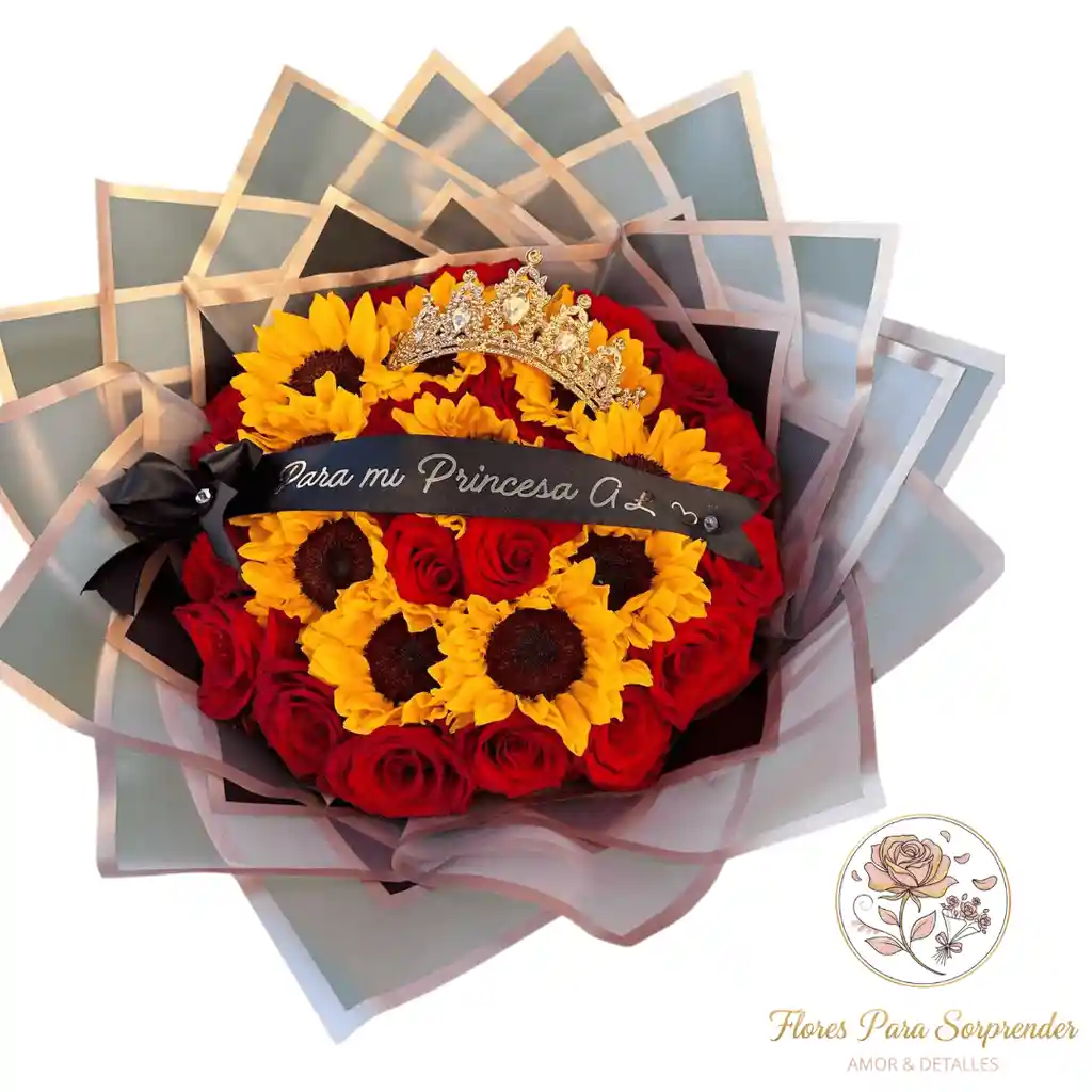 Elegante arreglo floral elaborado con rosas rojas y girasoles frescos, acompañado de una delicada corona decorativa de acero y cinta personalizada con la frase que el cliente elija. Su diseño sofisticado y llamativo combina romanticismo y alegría, ideal para regalar en aniversarios, cumpleaños, pedidas especiales o para hacer sentir única a esa persona especial. Presentado con envoltura premium para un acabado impactante y de alta calidad.
